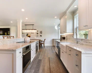 This kitchen is made for family life. There is a large island for the kids to pull up a chair and do their homework. “From cramped and dated to open concept, this project features a kitchen and dining room made for entertaining and taking advantage of the beautiful lake view,” according to the design statement. “The clean, open appearance of the new white cabinets pairs with the backsplash. The open floor plan makes daily living easier for the entire family.” Potter Construction, potterconstruction.com