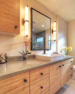 This entire bathroom was renovated to create space for a walk-in shower with a frameless enclosure. Pebble tiles, oil-rubbed fixtures, and floating bamboo cabinetry all come together harmoniously. “Old World charm becomes New World luxury with the remodel of this main bathroom in Rainier Vista,” according to the design statement. “The clients — artists themselves — worked with the design team to plan a masculine, modernized space.” Irons Brothers Construction, ironsbc.com