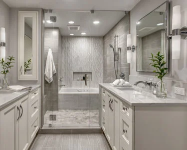 Simple yet elegant, this bathroom was once awkward. The team removed some walls and made way for a spacious tub and shower combo, with Venetian marble tile. “It (provided) the aesthetic of natural stone without the maintenance — or the price-tag. Budget-friendly floor tile and baseboards, and a coordinating mosaic shower tile provide an appealing color palette that blends with the stocking gray quartz countertop,” according to the design statement. “A standard-size furniture style vanity with crystal-cut acrylic knobs provides a traditional feel and open towel storage.” Sockeye Homes, sockeyehomes.com