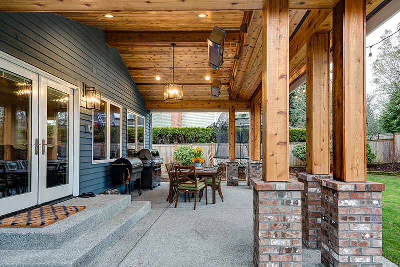 The outdoor covered structure was built adjacent to the owners’ newly remodeled kitchen and family room. Material selections and architectural design focused on a structure that would complement the existing roofline and not block the view from the upper bedroom windows. Gas powers the barbecue and smoker, as well as two commercial-grade gas-powered heaters for all-season use. Recessed lighting and Bluetooth speakers were installed in the ceiling, and a beautiful hanging pendant tops off the details. Irons Brothers Construction