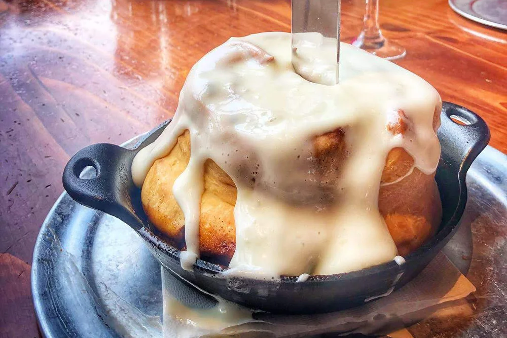 Those with a sweet tooth need look no further than the s’mores pancakes (as big as the plate and stacked), apple cinnamon French toast with golden raisins, caramel sauce, and whipped cream, or the cast-iron cinnamon roll.